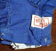 una etiqueta blanca con letras rojas que decía el nombre de la muñeca